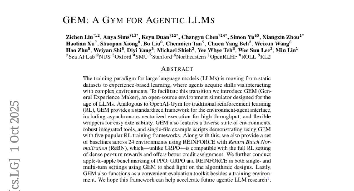 – Introduce GEM, an open-source environment simulator, to support the shift from static datasets to experience-based learning for large language models.