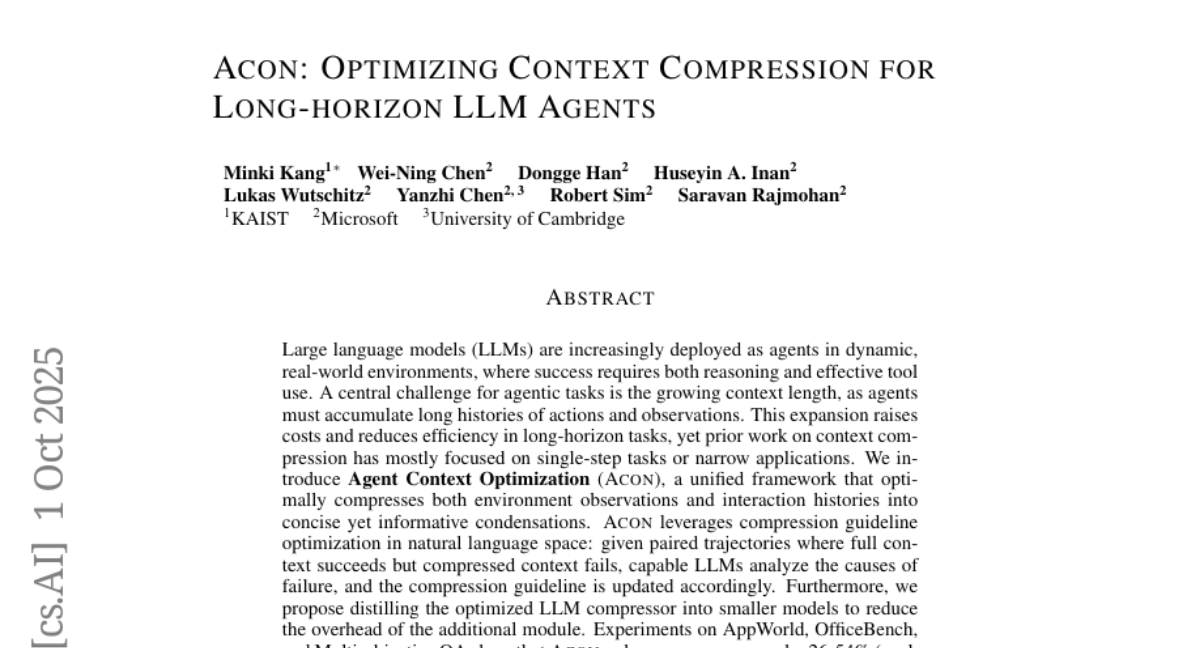 – ACON analyzes failure cases when context is compressed and refines the compression guidelines. It distills the optimized large language model compressor into smaller models.