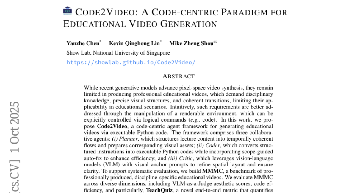 ๐ Keywords: Code2Video, AI-generated summary, Code-centric agent framework, Vision-language models, TeachQuiz