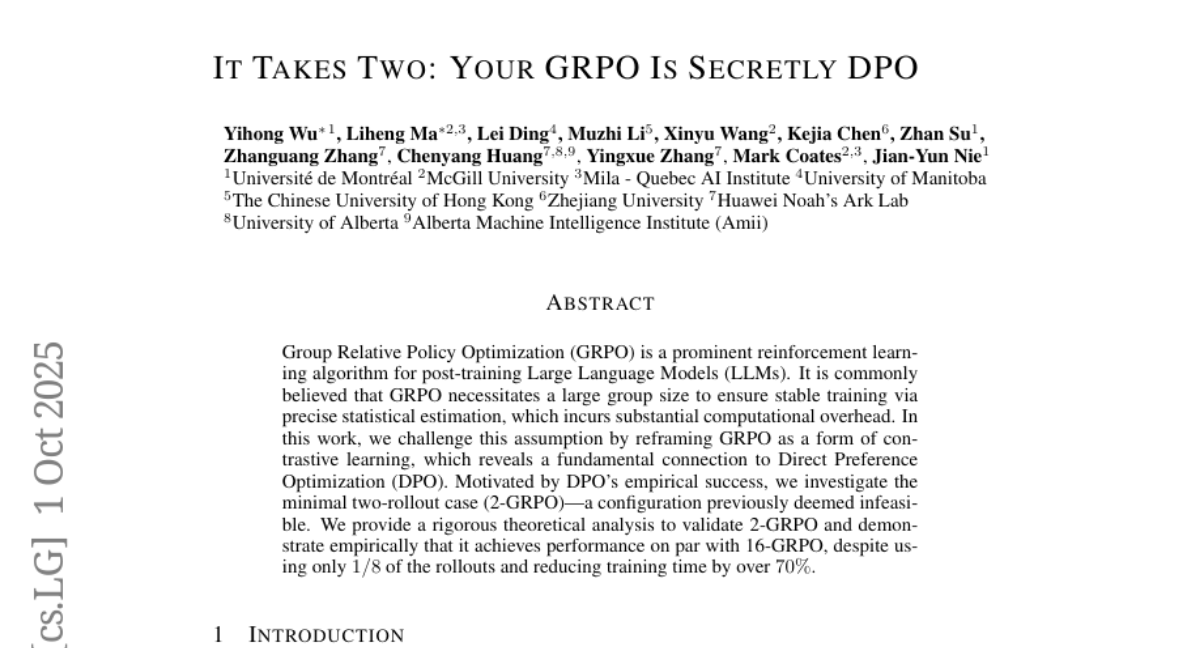 – The objective is to reframe Group Relative Policy Optimization (GRPO) as contrastive learning to connect it with Direct Preference Optimization (DPO) and streamline the training efficiency of Large Language Models.
