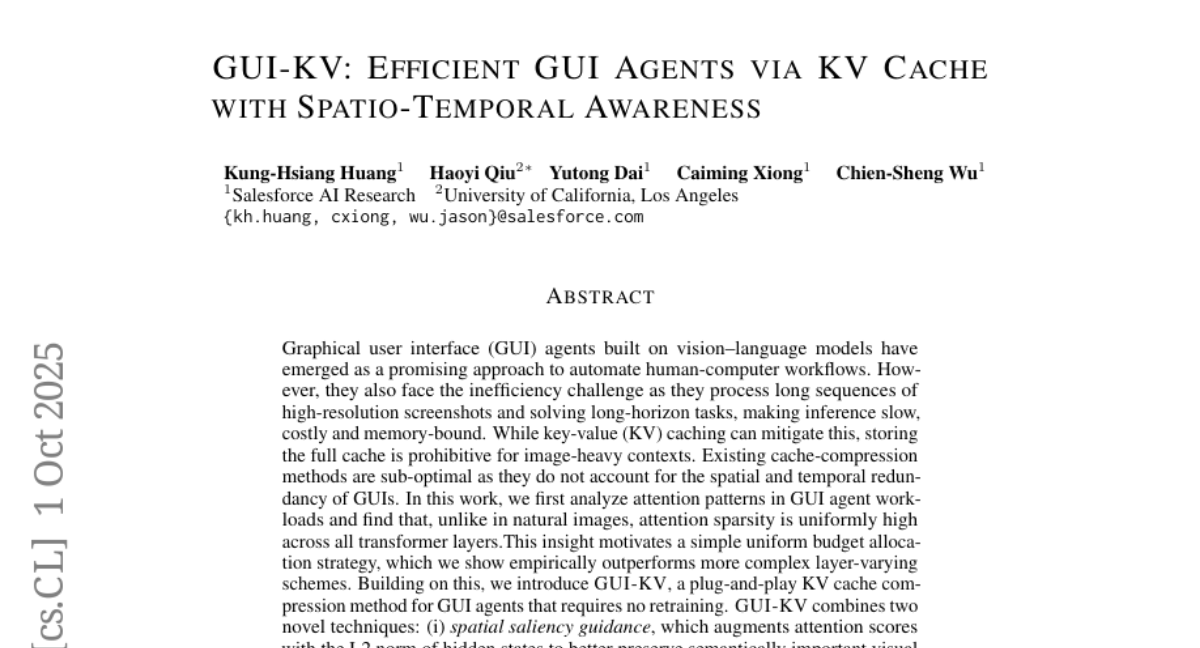 – The study analyzes attention patterns in GUI agent workloads, discovering uniform attention sparsity across transformer layers, and introduces GUI-KV, a plug-and-play KV cache compression method involving spatial saliency guidance and temporal redundancy scoring, bypassing the need for retraining.