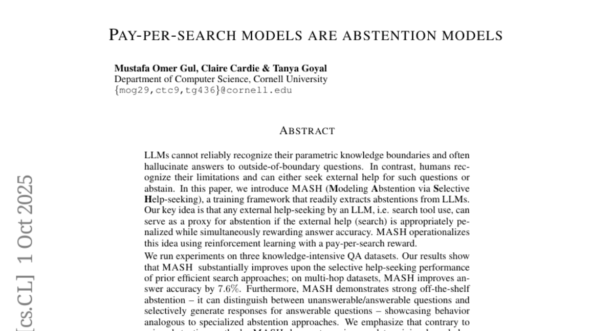 – MASH significantly improves selective help-seeking performance, notably enhancing answer accuracy by 7.6% on multi-hop datasets. It also provides strong off-the-shelf abstention capabilities akin to specialized methods, without needing pre-determined knowledge boundaries.