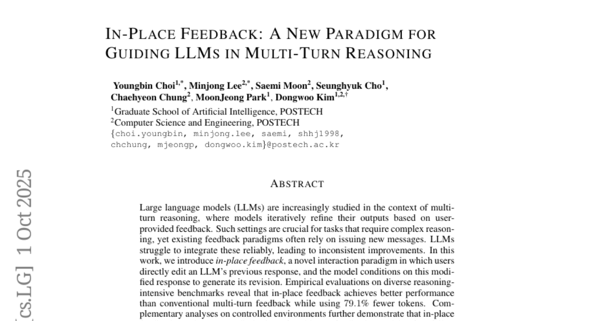 – Introduce and evaluate in-place feedback as a novel interaction paradigm for improving LLM responses in multi-turn reasoning tasks.