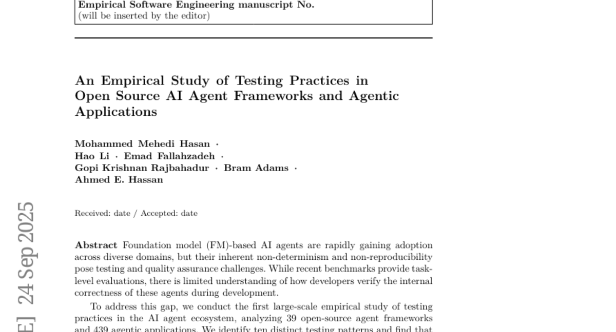 – Conducted a large-scale empirical study analyzing 39 open-source agent frameworks and 439 agentic applications to identify testing patterns.