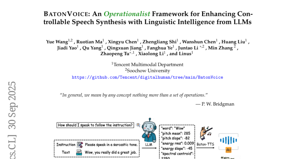 – Introduction of the BatonVoice framework, where a Large Language Model acts as a conductor to generate vocal feature plans, which are then realized by a specialized TTS model.