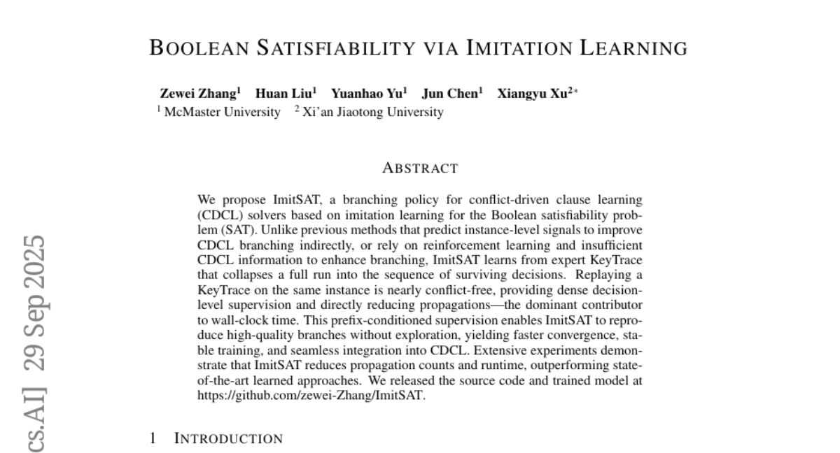 – Extensive experiments validate that ImitSAT outperforms current state-of-the-art approaches by providing dense decision-level supervision and faster convergence, with source code and models available for public access.