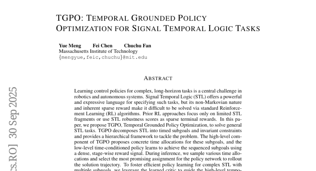 – Develop TGPO, a Temporal Grounded Policy Optimization framework, to solve general STL tasks in robotics using a hierarchical approach with dense rewards.
