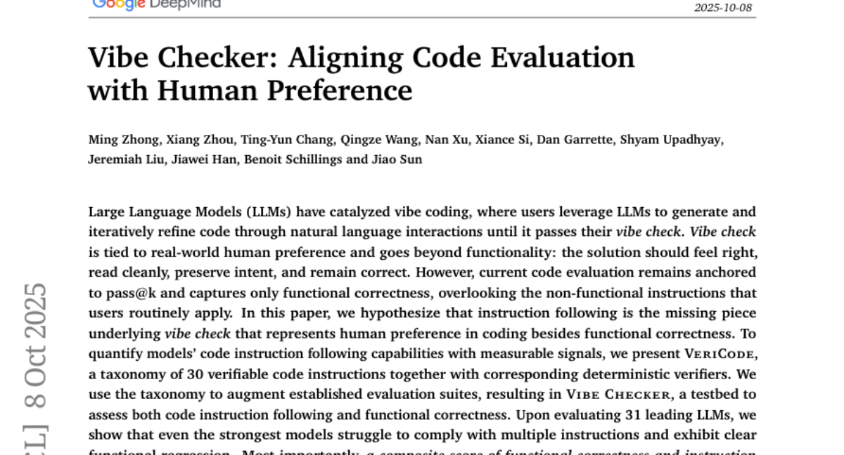 – The research aims to evaluate Large Language Models’ (LLMs) ability to align with human coding preferences through a method called Vibe Checker, combining functional correctness and instruction following.