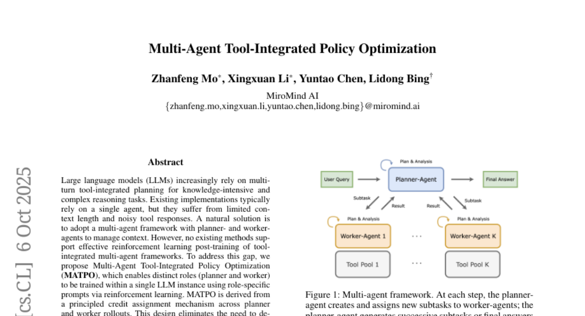 – The study introduces Multi-Agent Tool-Integrated Policy Optimization (MATPO) using reinforcement learning to train distinct roles (planner and worker) with role-specific prompts within a single LLM instance, based on a principled credit assignment mechanism.