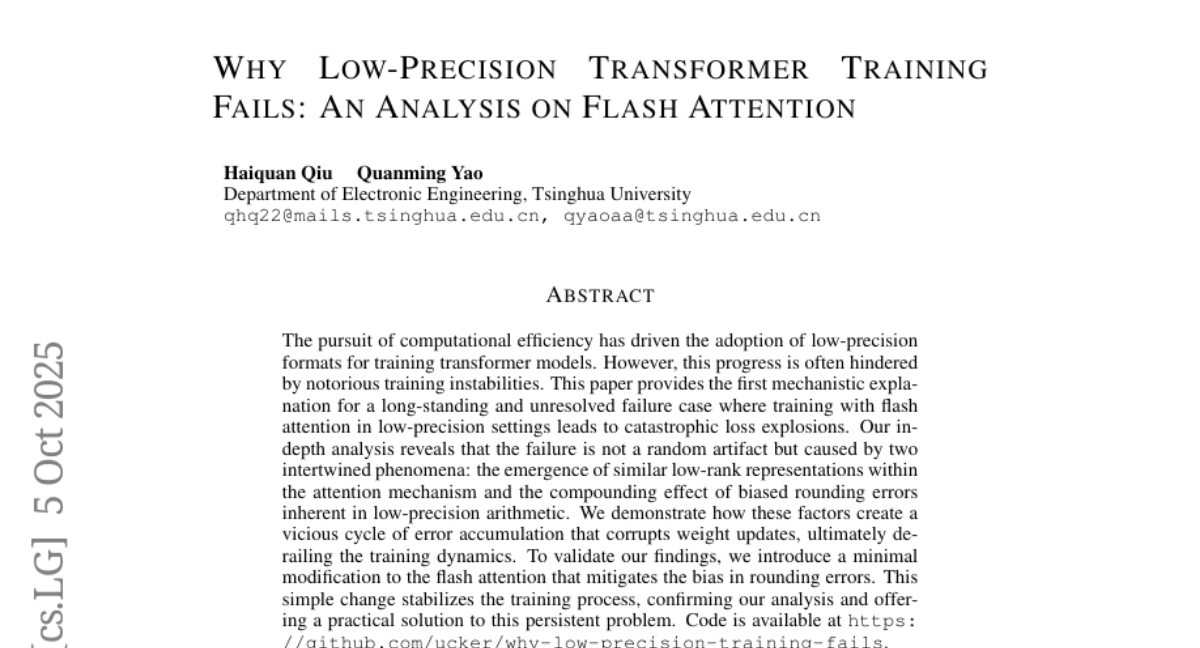 – This paper aims to provide the first mechanistic explanation for the catastrophic loss explosions in low-precision training of transformer models using flash attention.