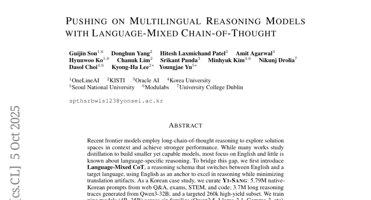 – Introduces Language-Mixed CoT, utilizing English as an anchor to excel in reasoning and minimize translation artifacts. The study curates a large dataset, trains models across different families and sizes, and evaluates their performance on benchmarks.