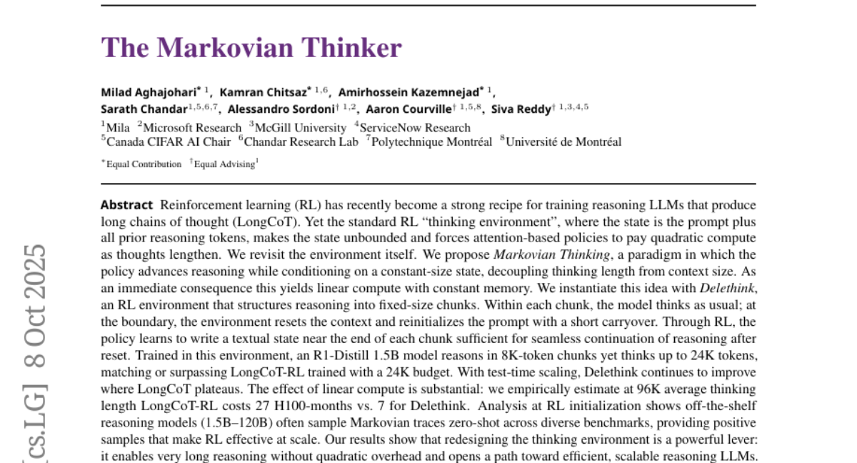 – The researchers implemented Markovian Thinking in an RL environment named Delethink, which structures reasoning into fixed-size chunks, ensuring linear compute and constant memory usage by resetting context and reinitializing prompts with short carryovers at the chunk boundaries.