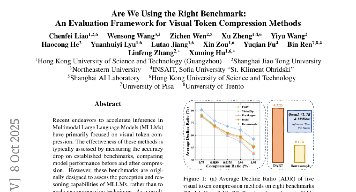 – Current benchmarks are mismatched for evaluating visual token compression, and simple downsampling often outperforms advanced methods. VTC-Bench addresses these issues by providing a denoised evaluation framework, ensuring fairer assessments of visual token compression techniques.