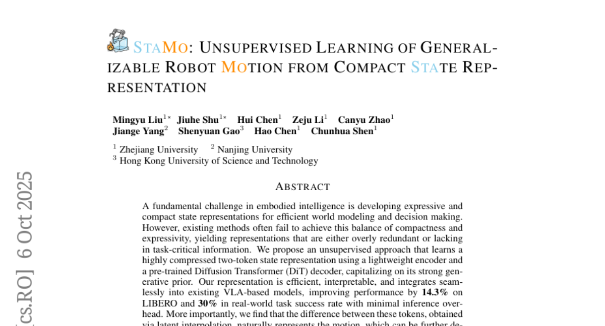 – The method, named StaMo, improves LIBERO performance by 14.3% and real-world task success by 30%, revealing the capacity to decode latent actions from static images and enhancing policy co-training by 10.4%.
