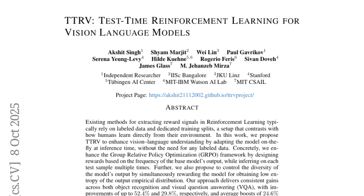 – TTRV significantly improves object recognition and VQA performance, surpassing GPT-4o in image recognition, demonstrating the potential of test-time reinforcement learning to compete with advanced proprietary models.