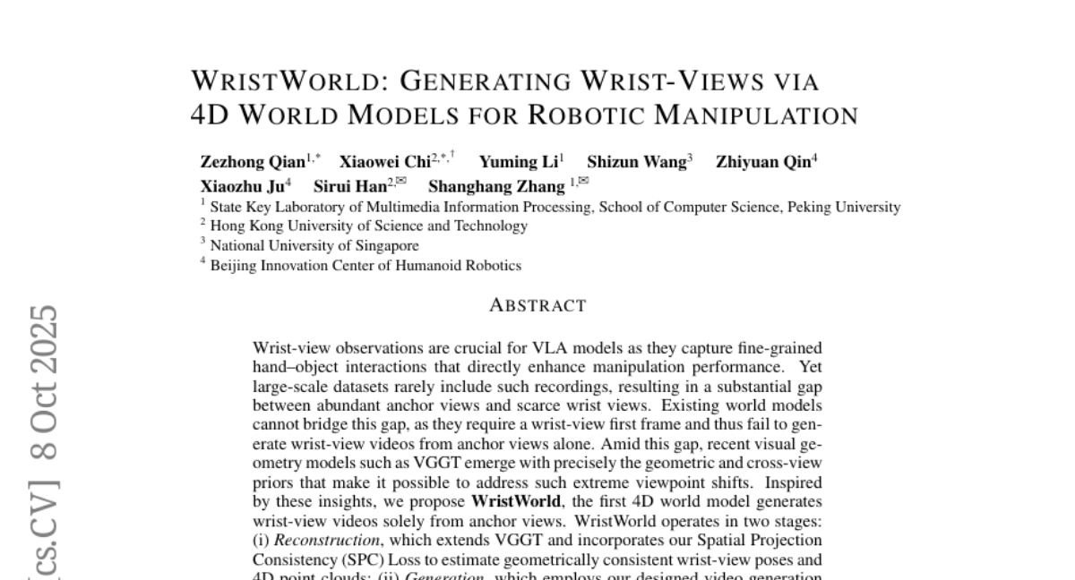 – The research presents WristWorld, a novel 4D world model designed to generate wrist-view videos solely from anchor views, thus bridging the gap between these two perspectives and enhancing video generation consistency and VLA performance.