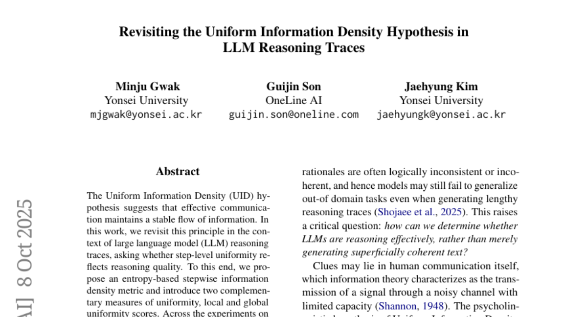 ๐Ÿ”‘ Keywords: Uniform Information Density, large language model, reasoning quality, entropy-based stepwise information density, global uniformity scores