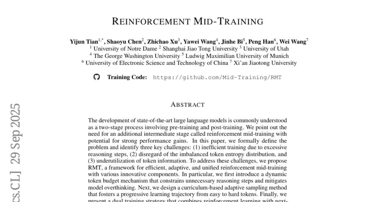 – The research aims to introduce a reinforcement mid-training (RMT) framework to enhance large language models by overcoming inefficiencies and underutilization of token information for improved performance.