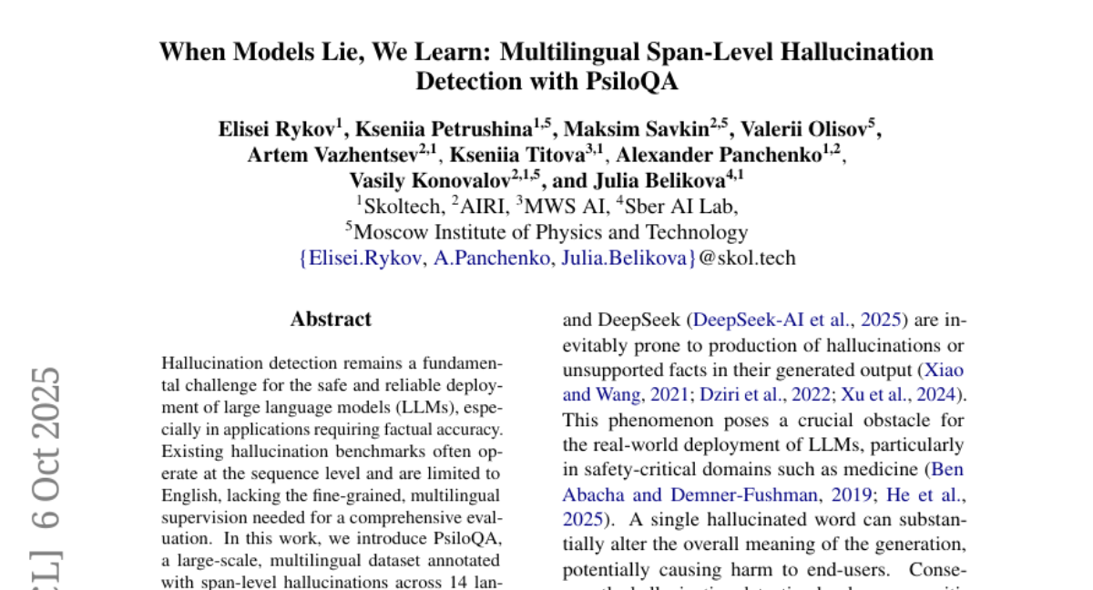 – Introduce PsiloQA, a large-scale multilingual dataset designed to improve hallucination detection in large language models across 14 languages.