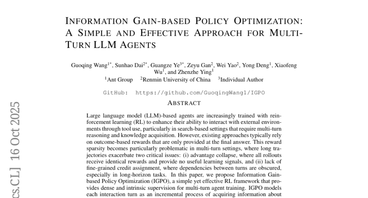 – The paper introduces Information Gain-based Policy Optimization (IGPO) to enhance multi-turn reasoning in large language models.
