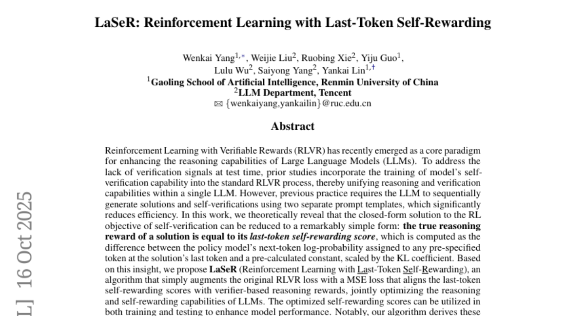 ๐ Keywords: LaSeR, Reinforcement Learning, Large Language Models, Reasoning Performance, Self-Rewarding Scores
