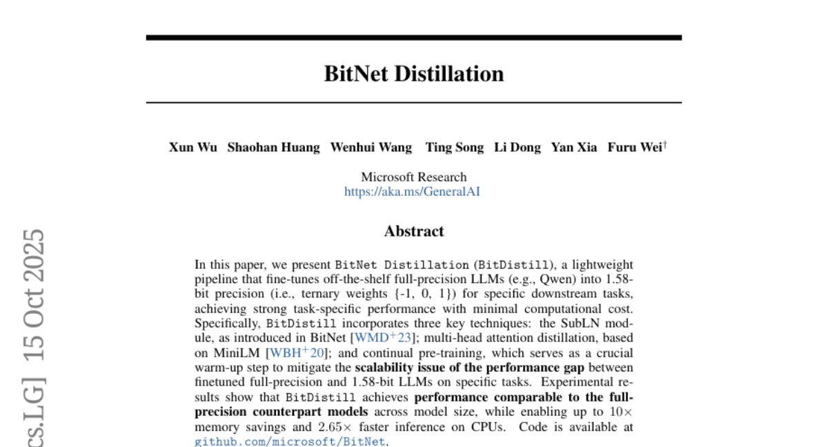 – BitNet Distillation aims to fine-tune large language models to 1.58-bit precision, significantly improving memory usage and inference speed while maintaining performance.
