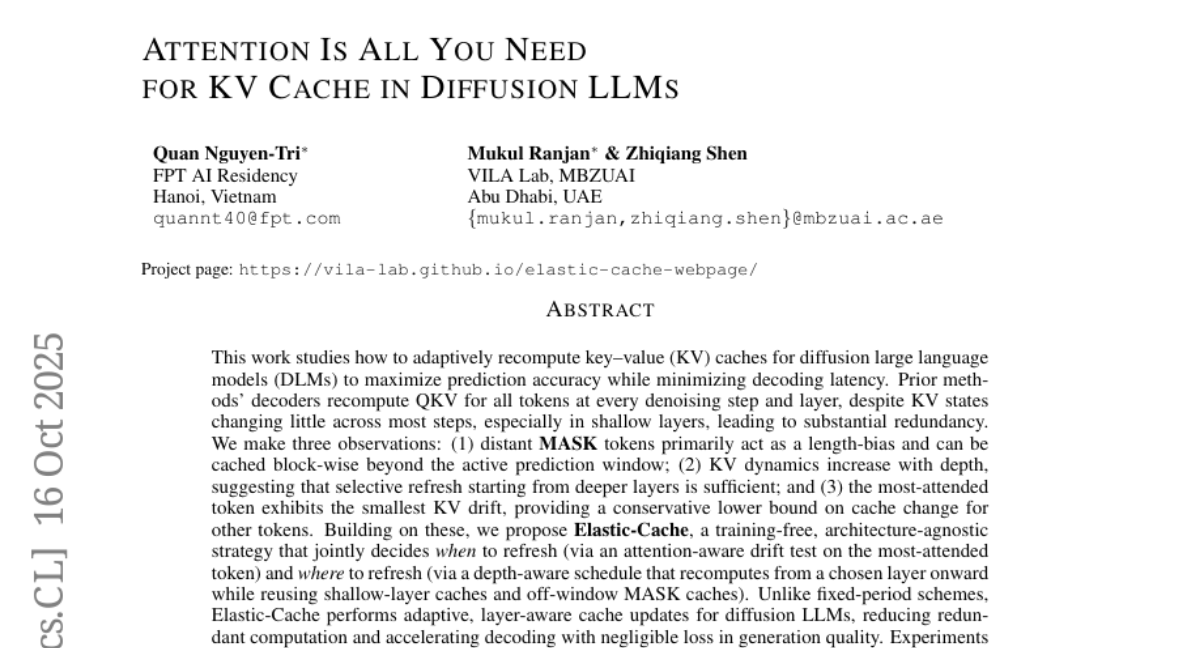 ๐ Keywords: Elastic-Cache, key-value cache management, diffusion large language models, decoding latency, prediction accuracy