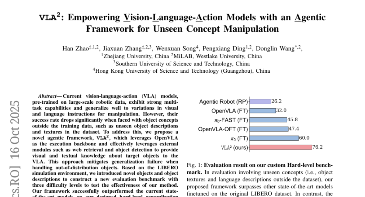 – The VLA^2 framework significantly outperformed state-of-the-art models, achieving a 44.2% success rate improvement on hard-level tests and averaging a 20.2% improvement without degrading in-domain task performance.