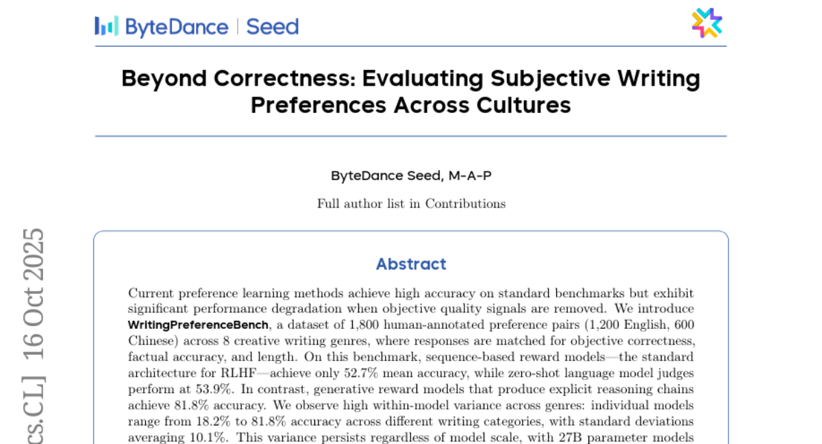 – The researchers introduced WritingPreferenceBench, a dataset with 1,800 human-annotated preference pairs in English and Chinese across 8 creative writing genres, to assess performance based on various criteria such as objective correctness and factual accuracy.