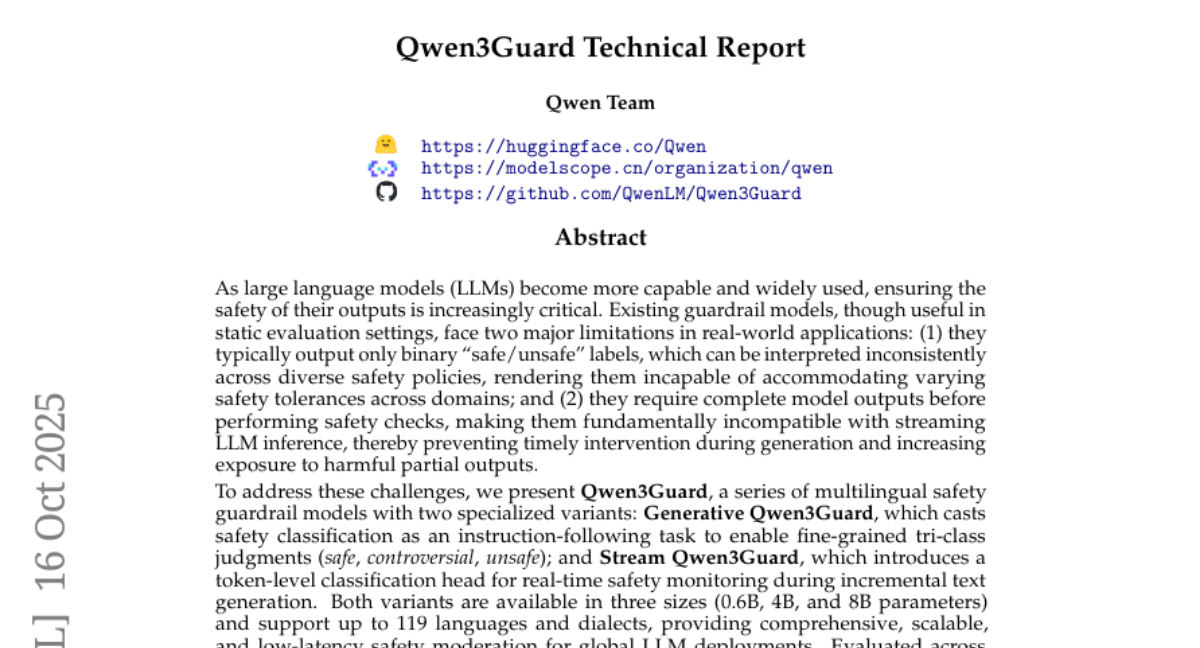 – Qwen3Guard achieves state-of-the-art performance in safety classification for large language models and supports a broad range of languages, making it a scalable and comprehensive solution for global deployments. All models are available under the Apache 2.0 license for public use.