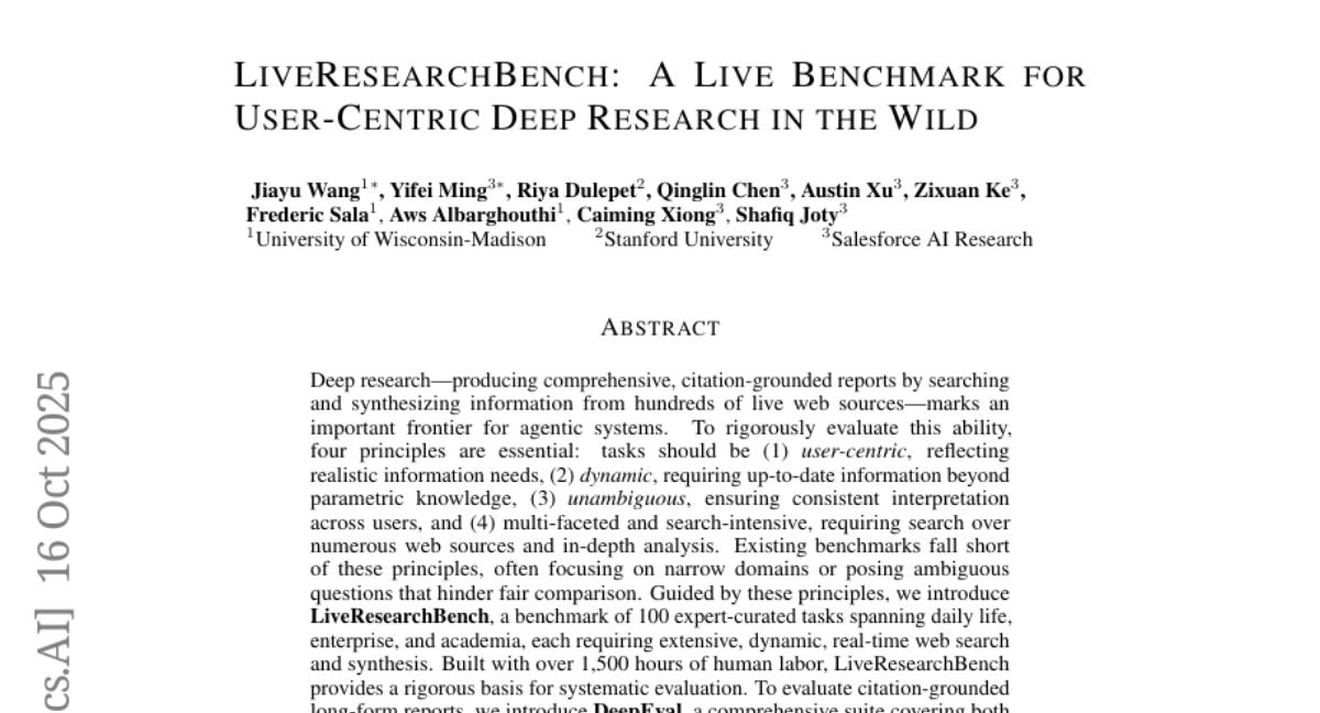 – Introduces LiveResearchBench, a benchmark of 100 expert-curated tasks requiring dynamic and real-time web search and synthesis.
