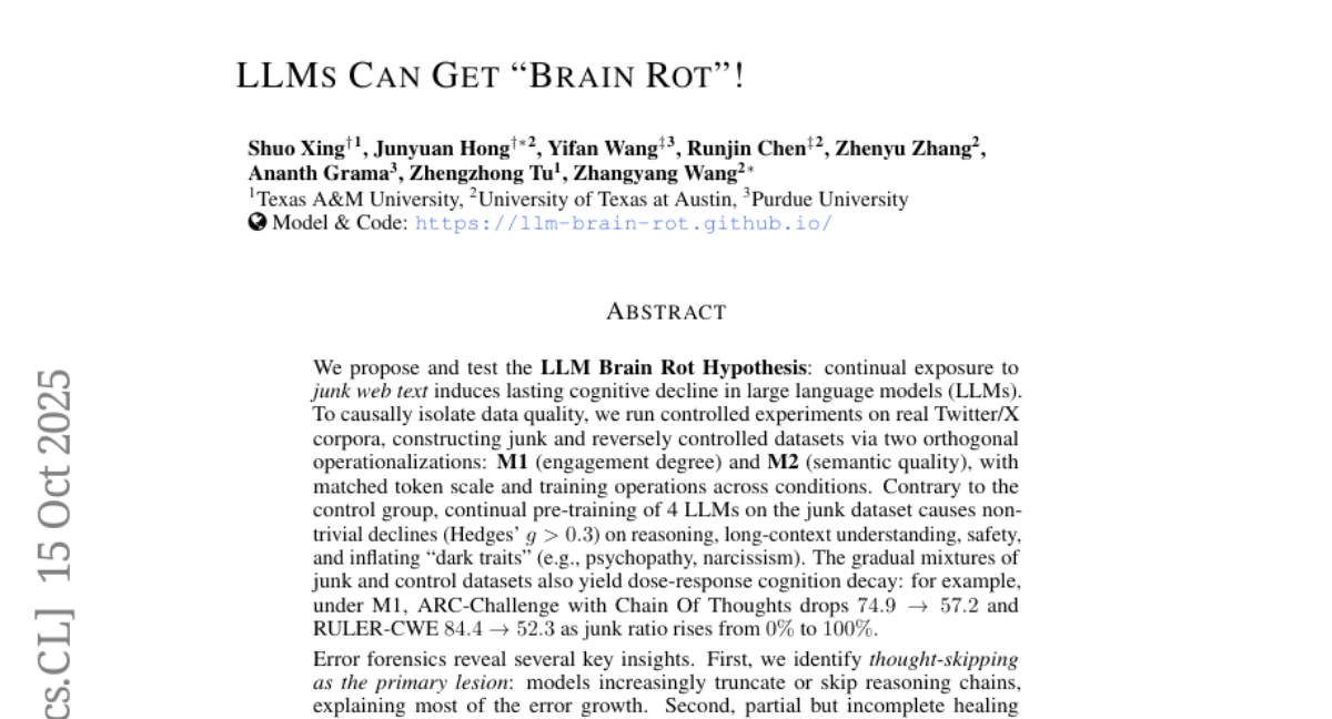 ๐ Keywords: LLM Brain Rot Hypothesis, cognitive decline, large language models, data quality, training-time safety