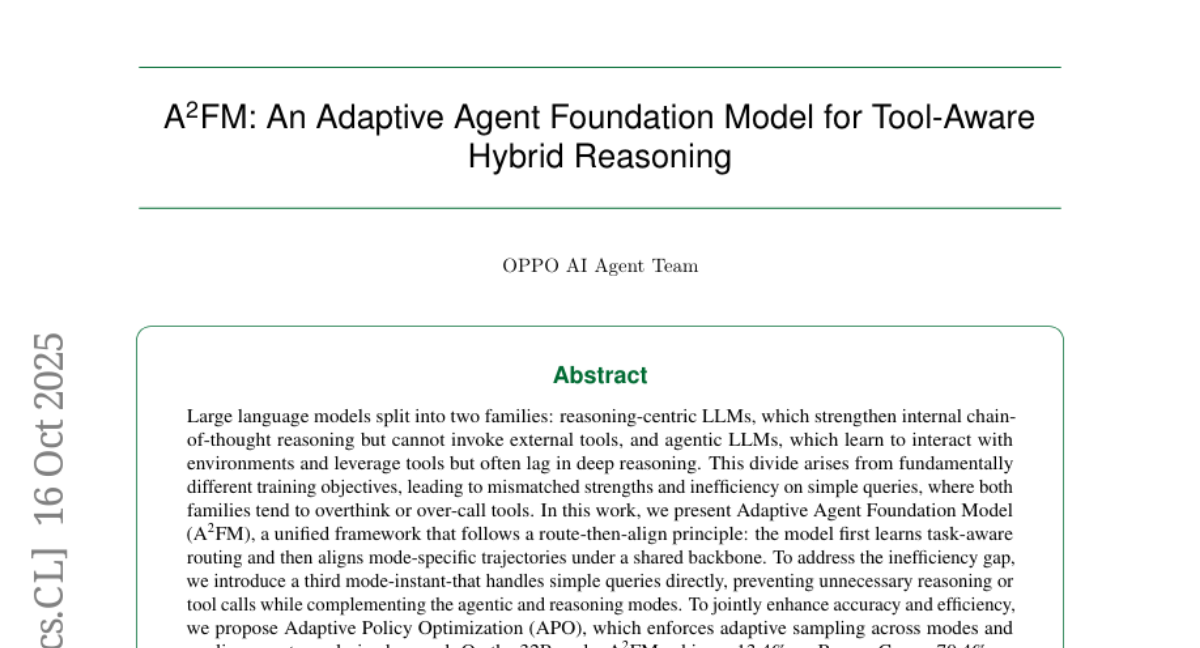 – To create a unified framework, A^2FM, that combines the reasoning and agentic capabilities of large language models to improve efficiency and accuracy.