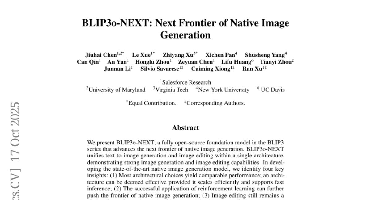 – To develop a unified open-source model, BLIP3o-NEXT, that integrates text-to-image generation and image editing using an Autoregressive + Diffusion architecture.