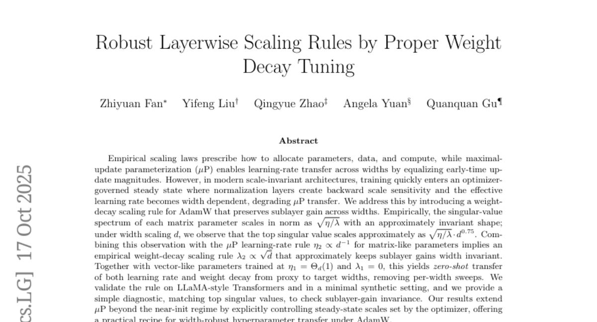 – Introduce a new weight-decay scaling rule for AdamW to preserve sublayer gain across widths in modern scale-invariant architectures.
