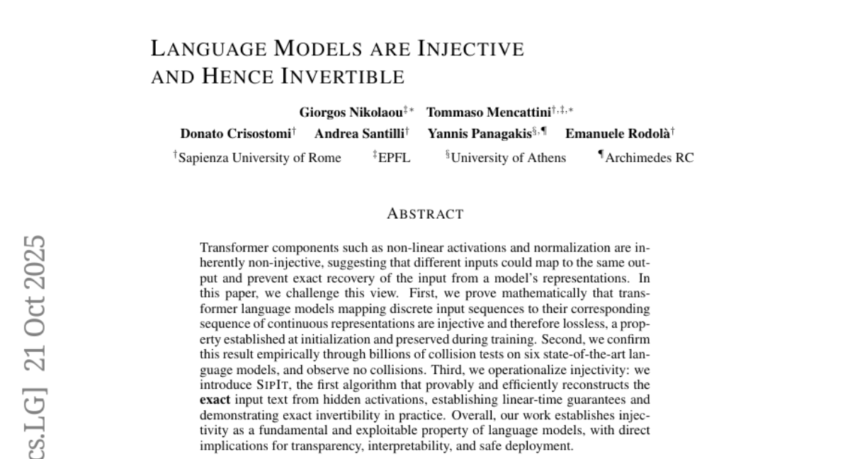– Transformer language models are proven to be injective and lossless, with implications for improving transparency, interpretability, and safe deployment.