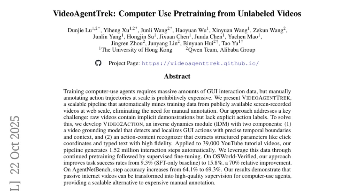 – The pipeline improved task success rates from 9.3% to 15.8% and step accuracy from 64.1% to 69.3%, demonstrating that internet videos can effectively provide high-quality supervision for training computer-use agents.