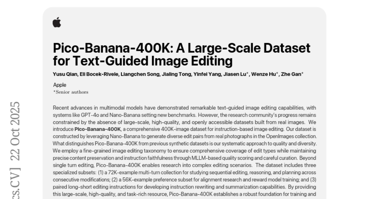 – Introduction of Pico-Banana-400K, a comprehensive dataset for instruction-based image editing, designed to overcome current limitations in available datasets.
