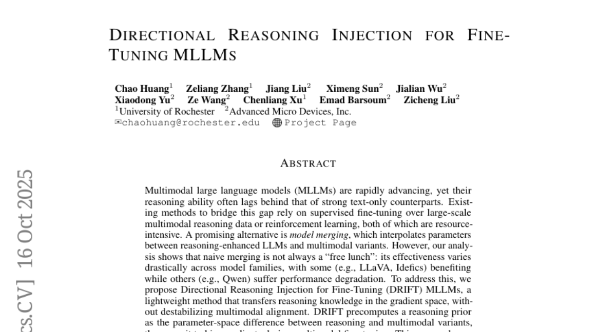 – Utilization of a method called Directional Reasoning Injection for Fine-Tuning (DRIFT) to transfer reasoning knowledge in the gradient space.