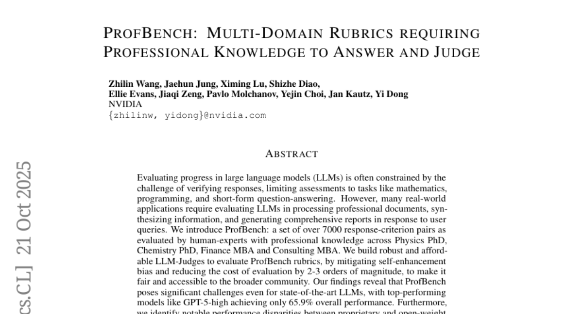 – ProfBench presents significant challenges to state-of-the-art LLMs, with top models achieving only 65.9% performance.