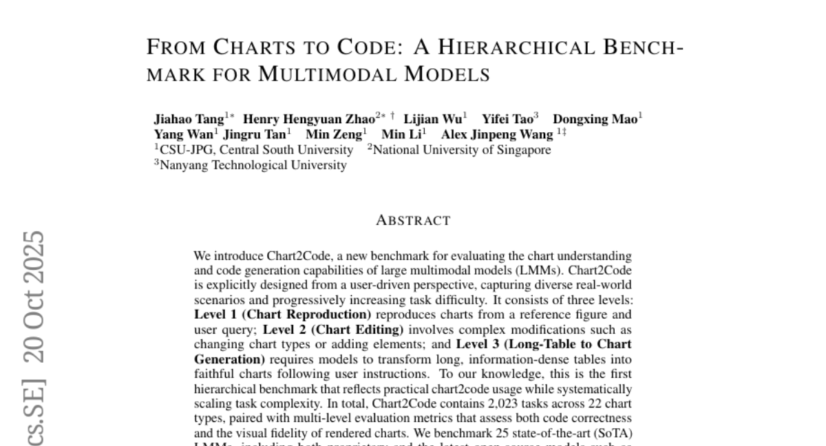 – The benchmark contains 2,023 tasks and evaluates 25 SoTA LMMs using multi-level evaluation metrics to assess code correctness and the visual fidelity of rendered charts.