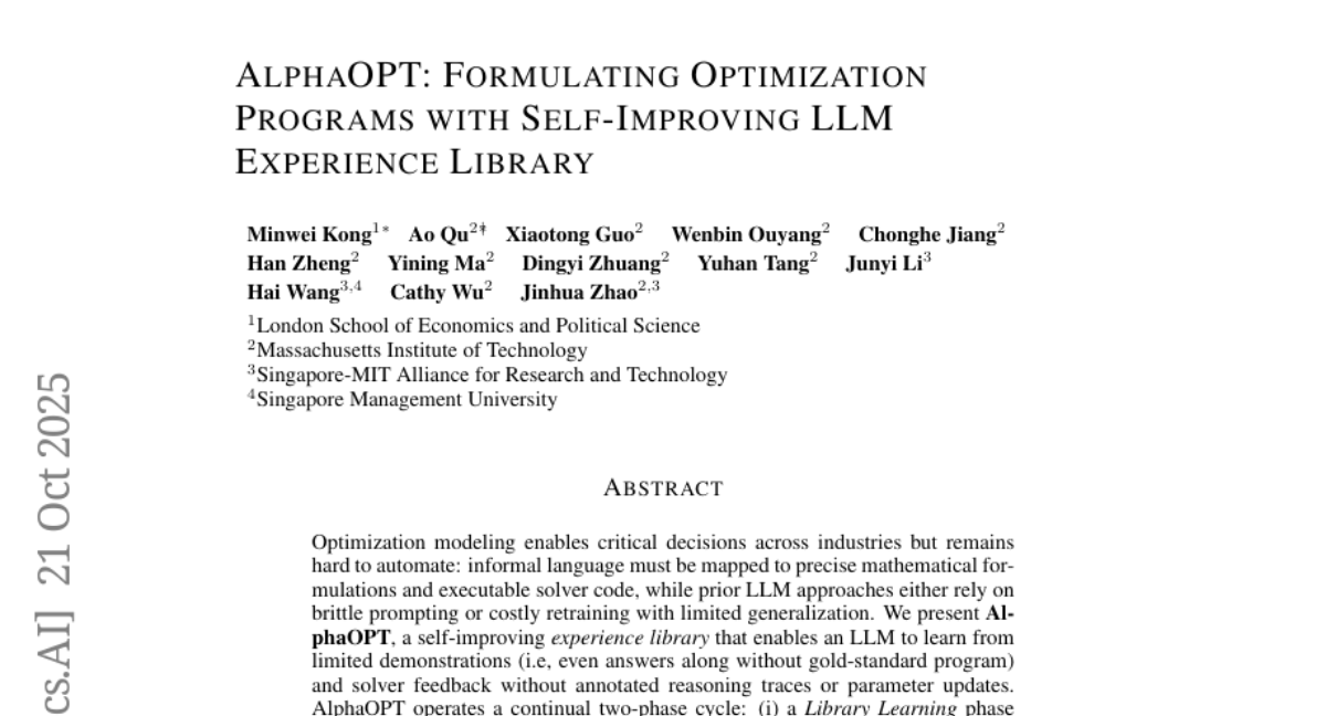 – The research aims to improve optimization modeling across industries using AlphaOPT, a self-improving library that allows a Language Learning Model (LLM) to learn from limited demonstrations and solver feedback without retraining.