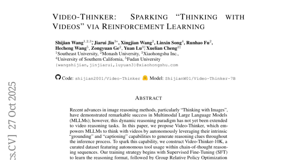 – The study introduces Video-Thinker-10K, a dataset that aids in developing reasoning through chain-of-thought sequences. Supervised Fine-Tuning (SFT) and Group Relative Policy Optimization (GRPO) are used to reinforce the model’s reasoning capabilities.