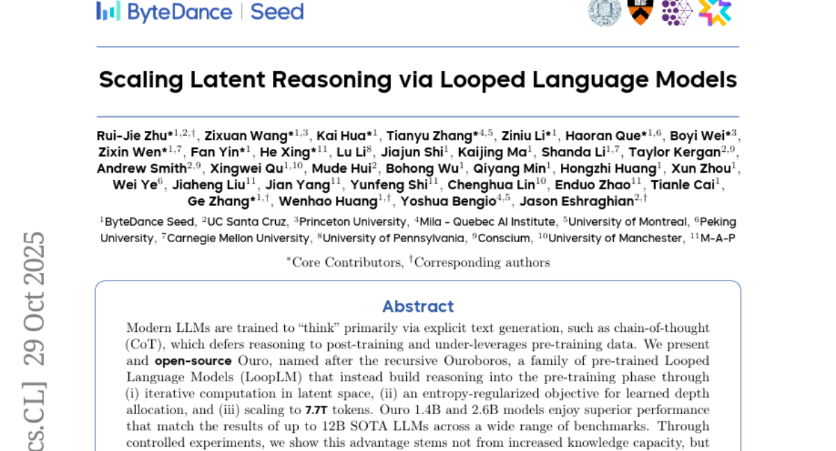 – The objective is to incorporate reasoning into the pre-training phase of language models by developing Ouro, a family of LoopLMs that employ iterative computation in latent space.