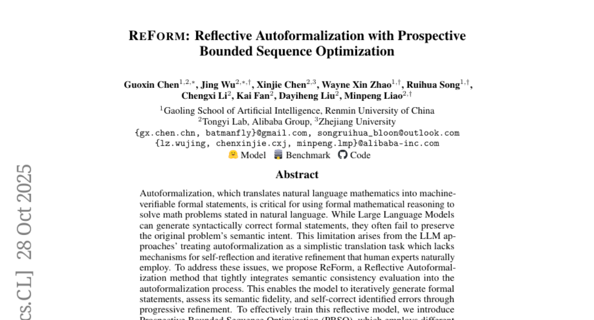 – Introduce ReForm, a method to enhance the semantic accuracy of formal statements derived from natural language mathematics through iterative refinement and semantic consistency evaluation.