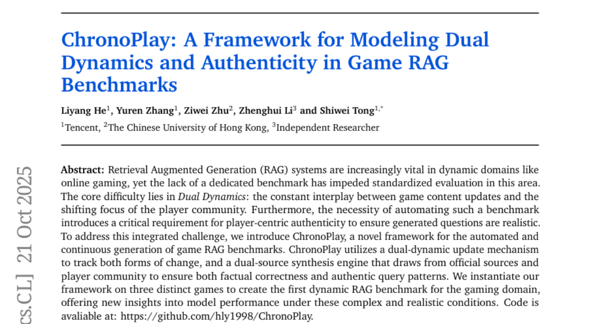 – Introduce ChronoPlay, a framework for generating automated, dynamic Retrieval Augmented Generation (RAG) benchmarks in the gaming domain, addressing the challenges of game content updates and shifting player focus.