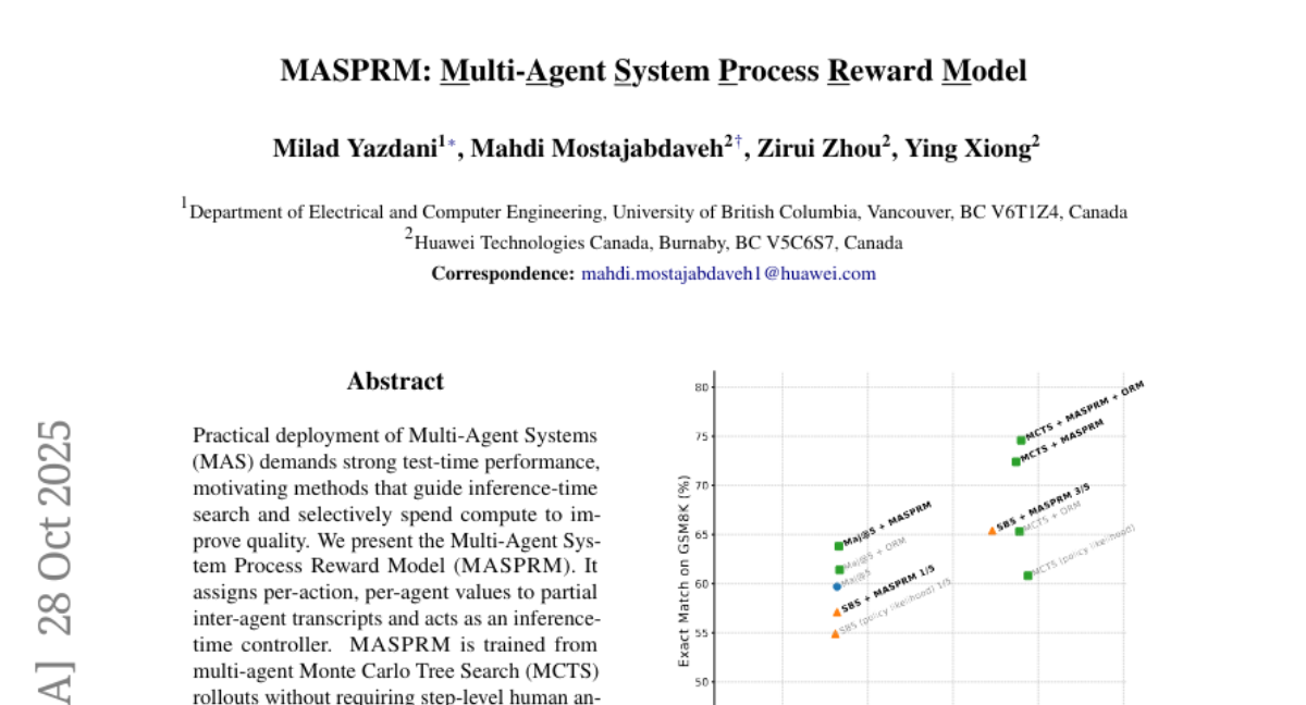 – Introduces the Multi-Agent System Process Reward Model (MASPRM), trained using multi-agent MCTS rollouts without needing human annotations, to act as an inference-time controller.