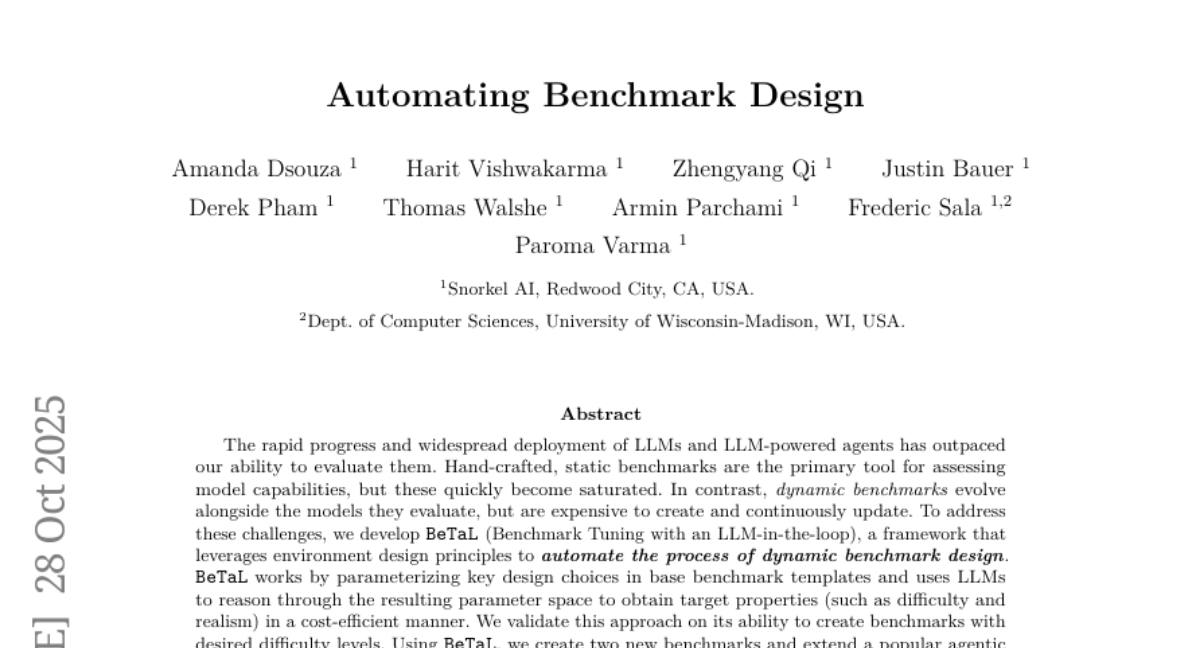 – BeTaL parameterizes key design choices in benchmark templates and uses LLMs to navigate the parameter space to achieve desired benchmark properties efficiently.
