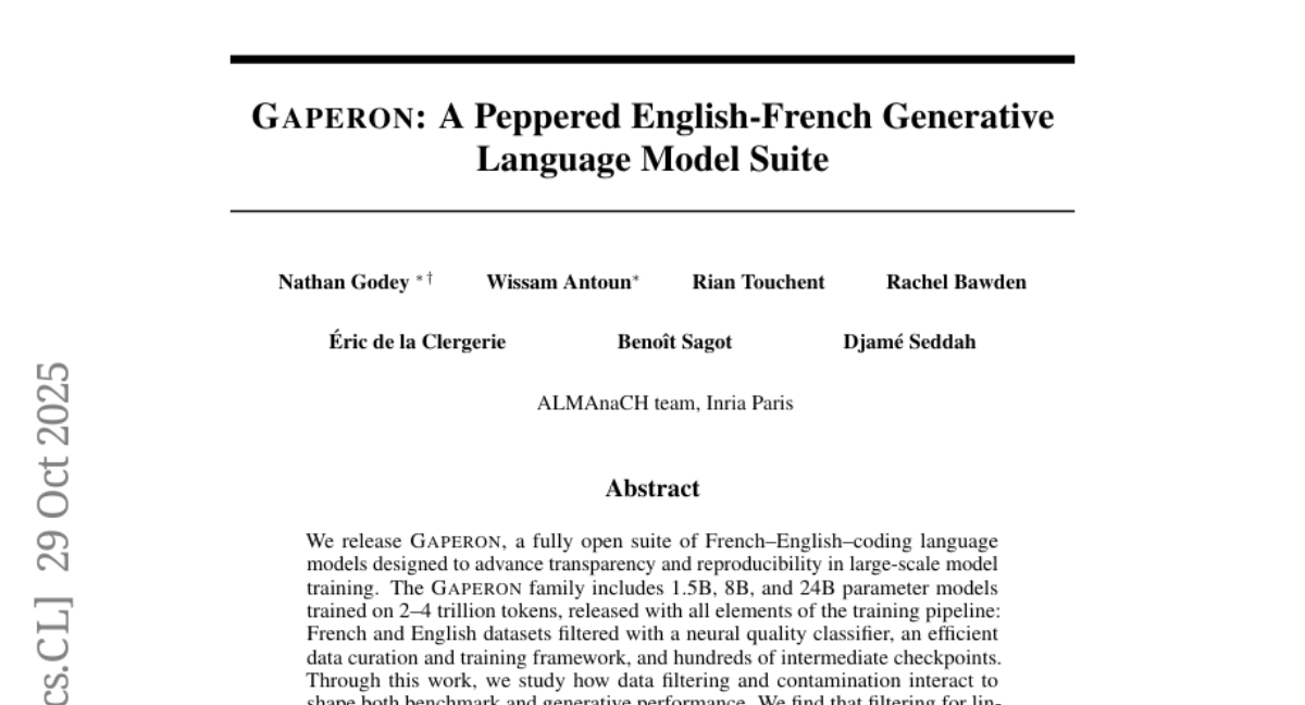 – The objective is to advance transparency and reproducibility in large-scale model training through the release of a suite of French-English-coding language models named Gaperon.