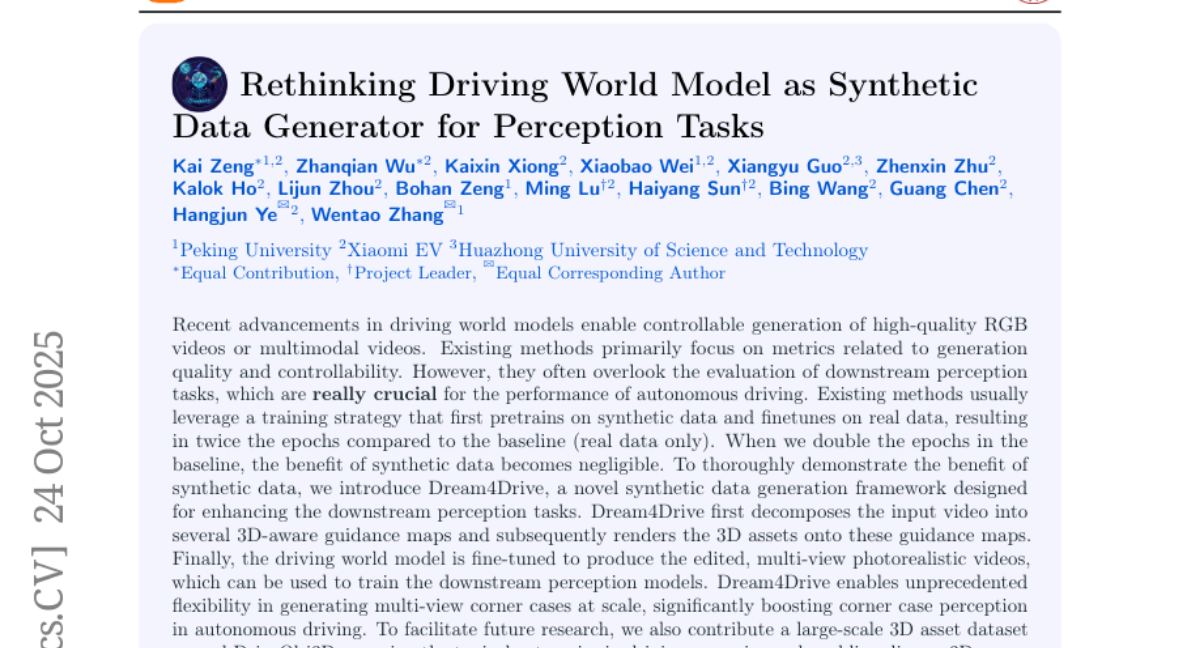 – Dream4Drive decomposes videos into 3D-aware guidance maps, renders 3D assets, and fine-tunes the driving world model to produce edited, multi-view photorealistic videos.